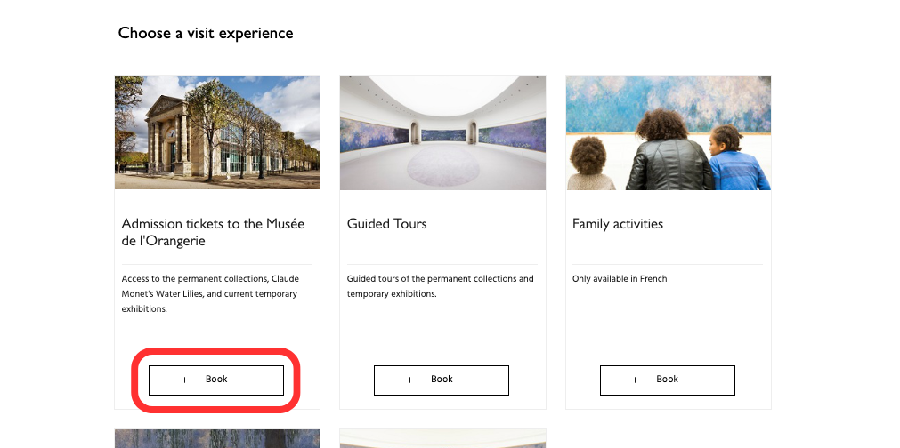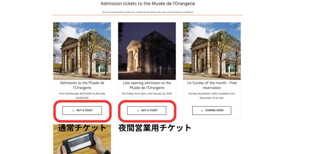 チケット予約ページにアクセスしたら、今回は入場チケットの購入なので【Admission tickets to the Musée de l’Orangerie】をクリック。