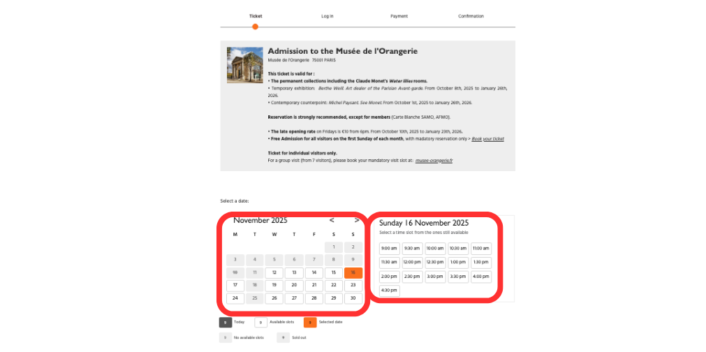 オランジュリー美術館は毎月第一日曜日は無料で入場できます。ただ、この日は必ず事前予約をしなければいけません。チケットは早い段階で売り切れてしまうので、なるべく早く予約する必要があります。