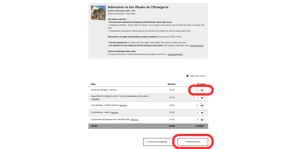 通常チケットの場合は【Admission to the Musée de l’Orangerie】を、夜間営業日のチケットの場合は【Late opening admission to the Musée de l’Orangerie】をクリックして進みます。