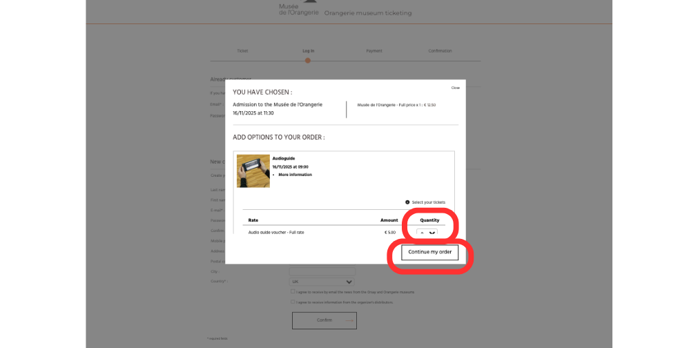 オーディオガイドの予約画面が現れるので、オーディオガイドを予約したい人は必要な数を入力して【Continue my order】をクリック。オーディオガイドはひとつ5€です。